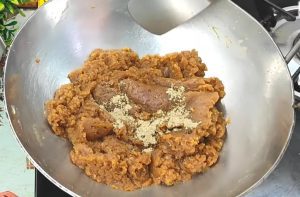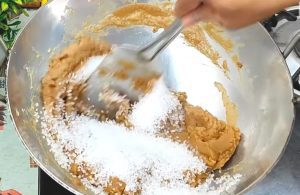 २। लोहे की कढ़ाई मैं चीनी मिलाएं: भूने हुए आटे में चीनी डालकर अच्छी तरह मिलाएं।